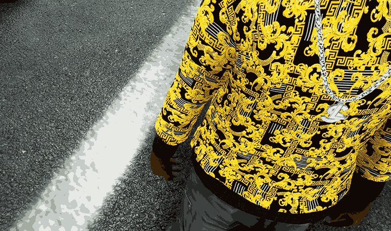 Replaces the Rockstar sweatshirt at Sub Urban with a Versace patterned sweater.
